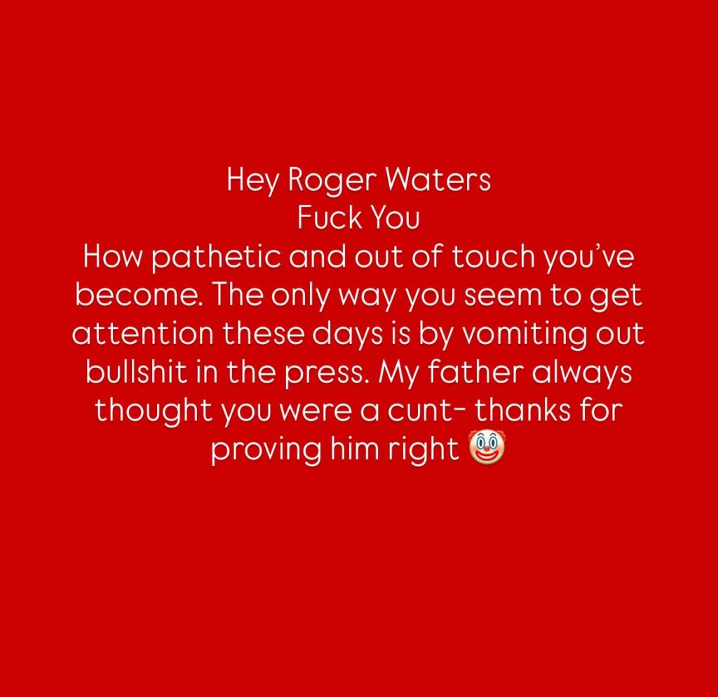 “Oye, Roger Waters, que te jodan. Qué patético y desconectado te has vuelto. Mi padre siempre pensó que eras un imbécil; gracias por darle la razón”.